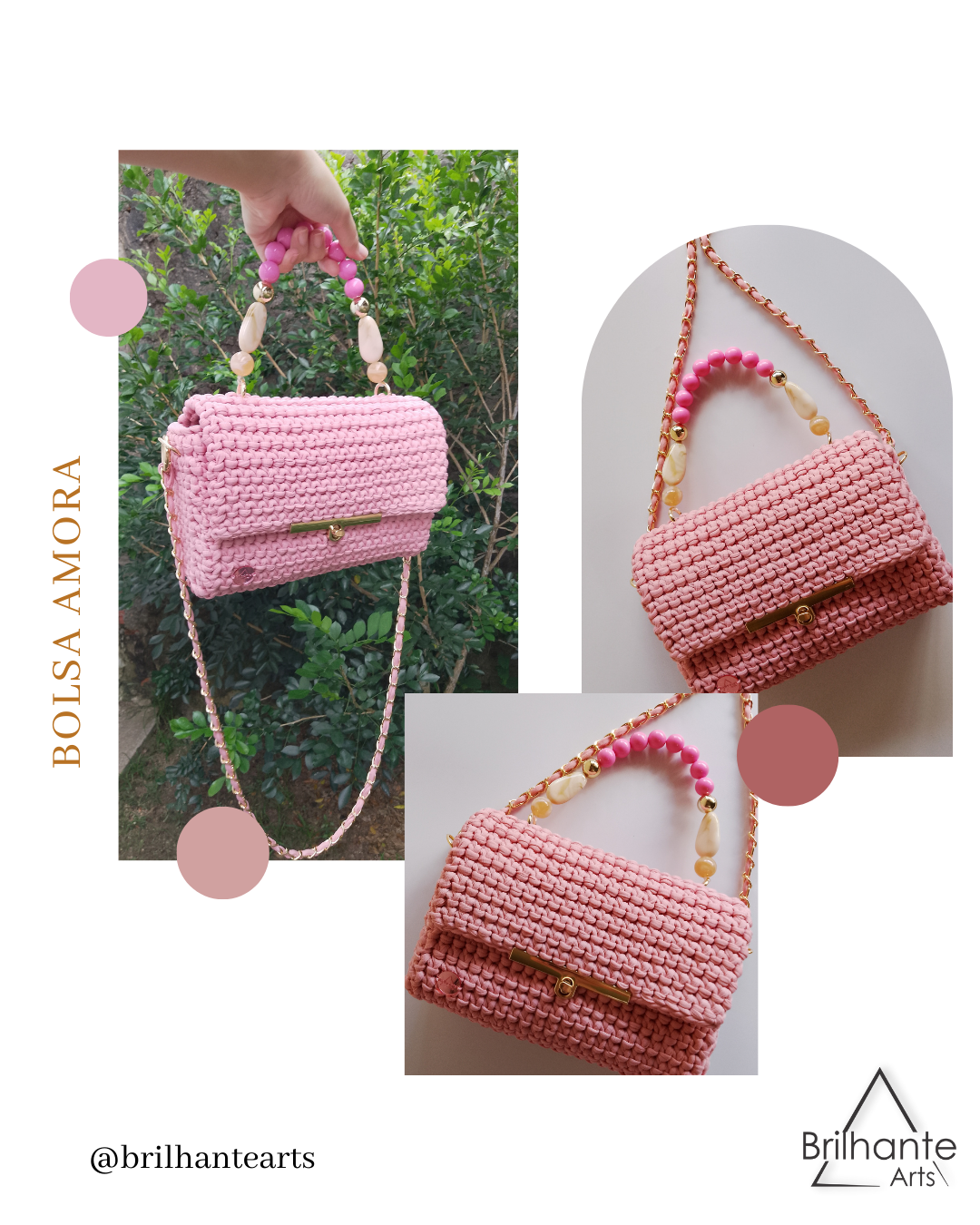 Ela possui duas alças sendo uma em corrente com fio de malha e uma em contas de crochê que deixa a nossa bolsa ainda mais charmosa.