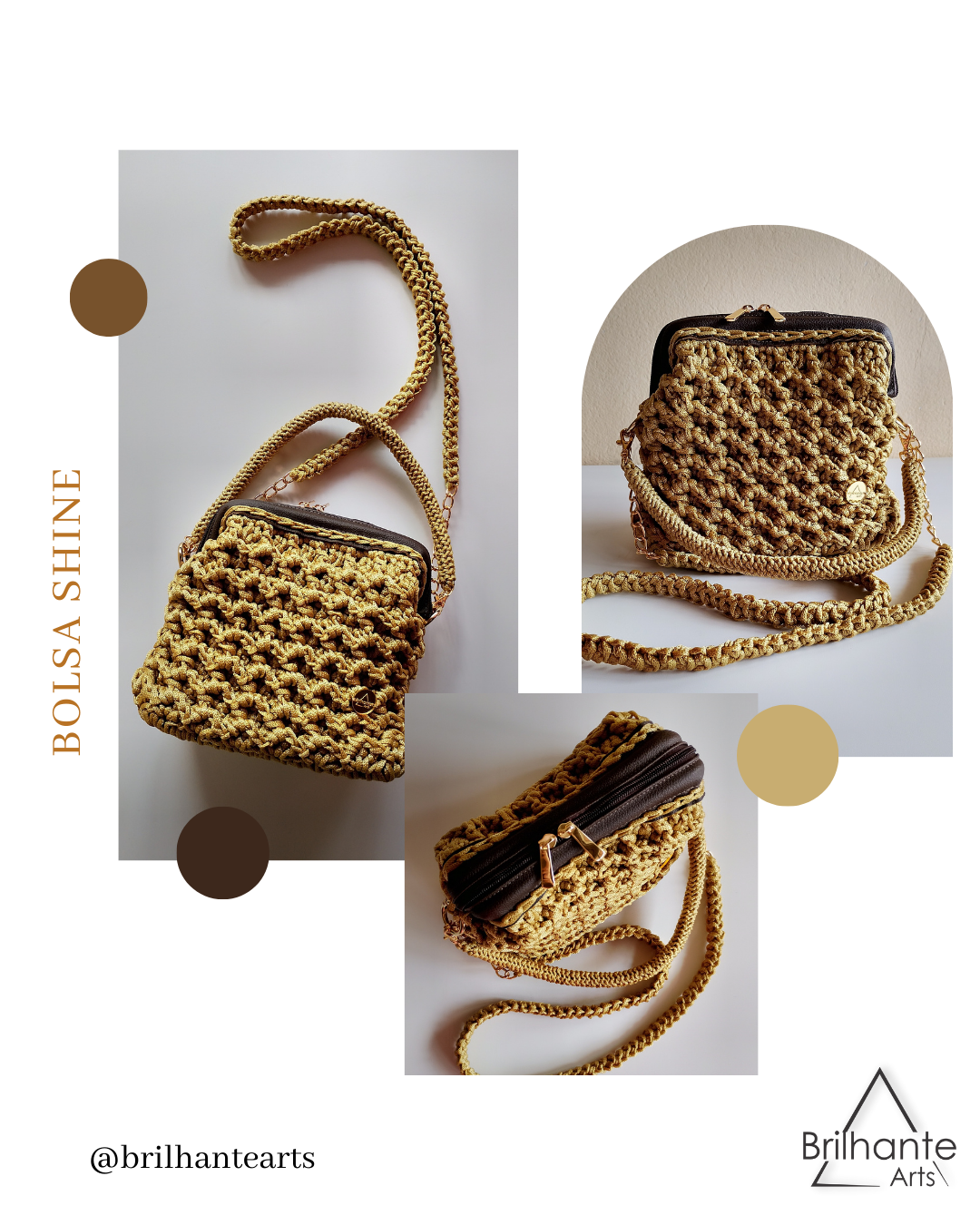 Alças: Possui alça dupla, uma de mão em crochê e uma alça de ombro em corrente com crochê.